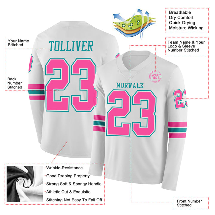 Custom White Pink-Teal Long Sleeve Authentic Football Jersey