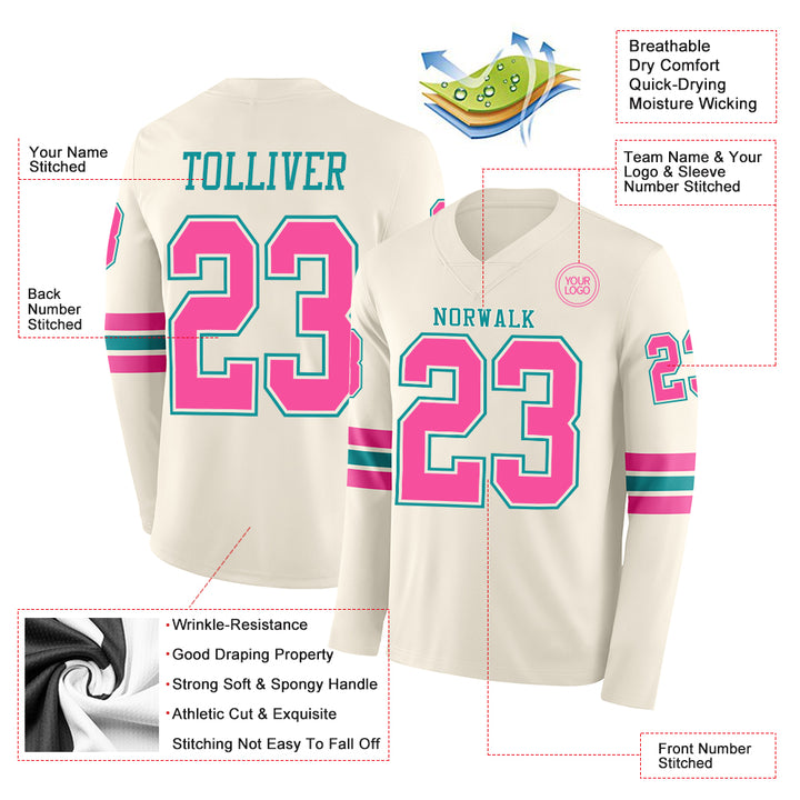 Custom Cream Pink-Teal Long Sleeve Authentic Football Jersey