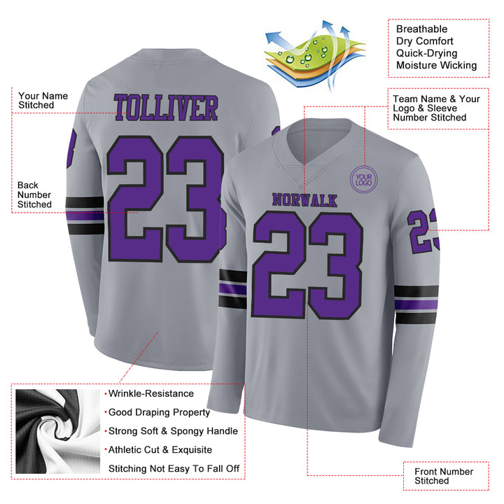 Custom Gray Purple-Black Long Sleeve Authentic Football Jersey