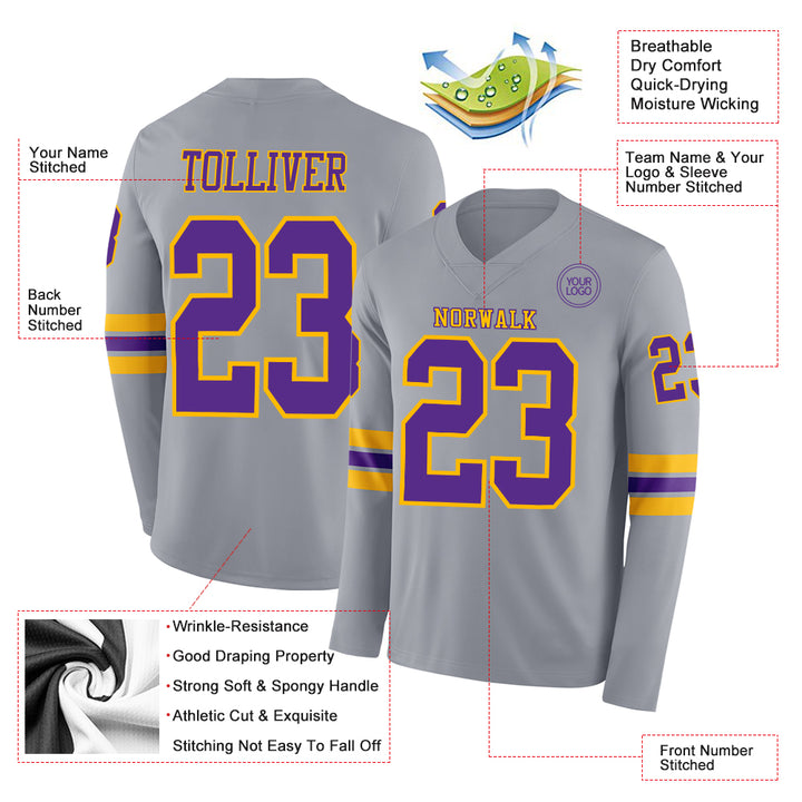 Custom Gray Purple-Gold Long Sleeve Authentic Football Jersey