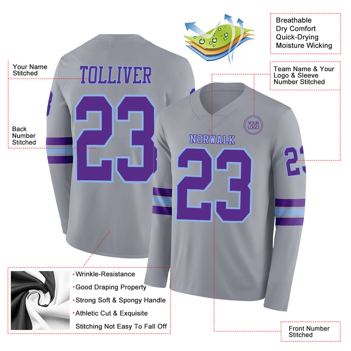 Custom Gray Purple-Light Blue Long Sleeve Authentic Football Jersey