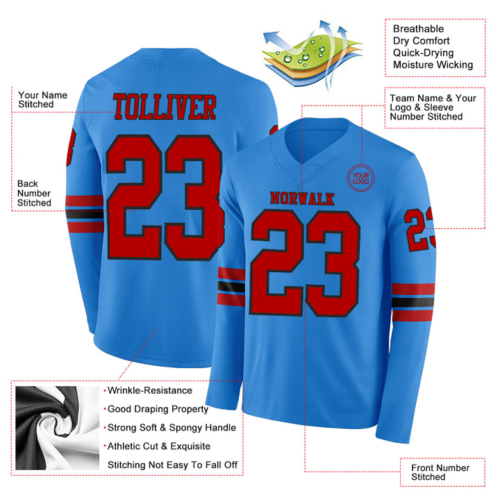 Custom Powder Blue Red-Black Long Sleeve Authentic Football Jersey