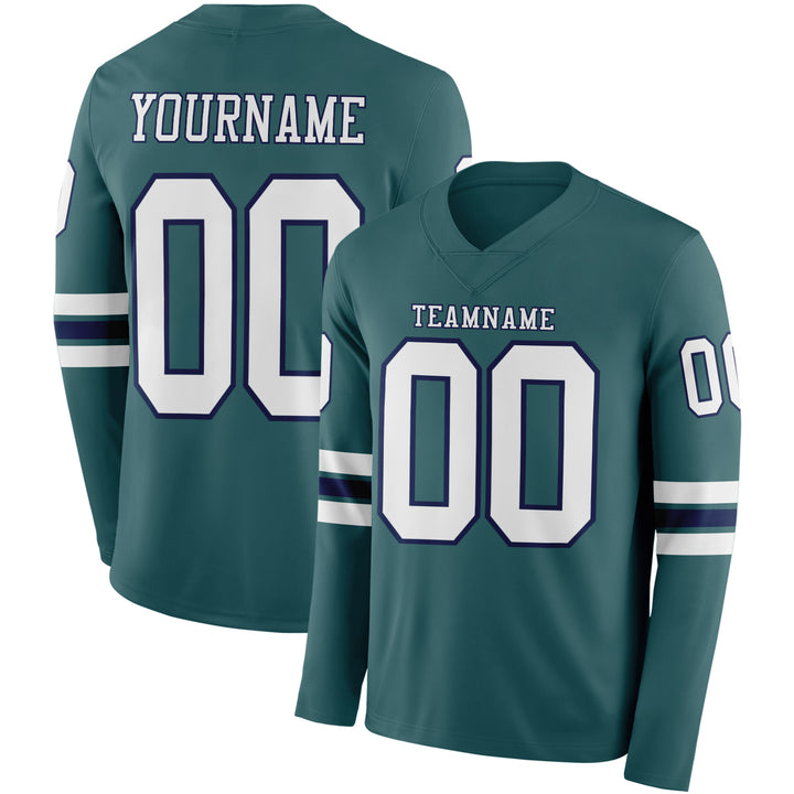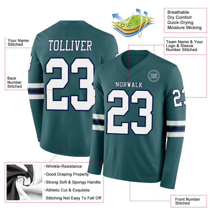 Custom Midnight Green White-Navy-White Long Sleeve Authentic Football Jersey