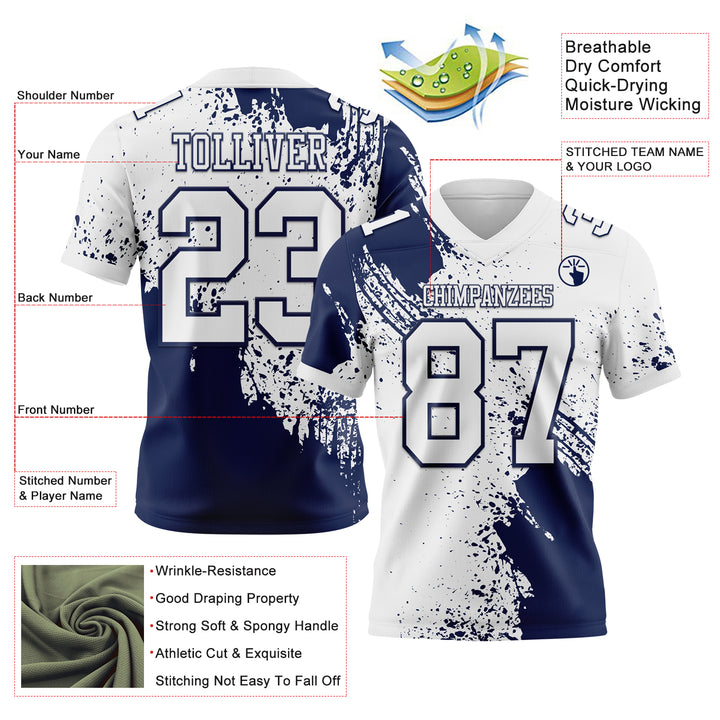 Custom White Navy 3D Pattern Abstract Brush Stroke Authentic Football Jersey