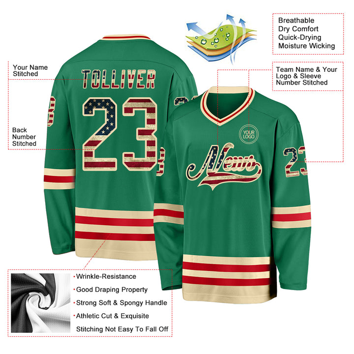 Custom Kelly Green Vintage USA Flag Cream-Red Hockey Jersey