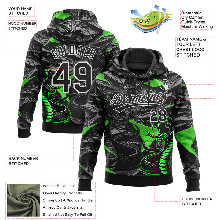 Custom Stitched Black Gray Green-White 3D Pattern Design Animal Snake Sports Pullover Sweatshirt Hoodie