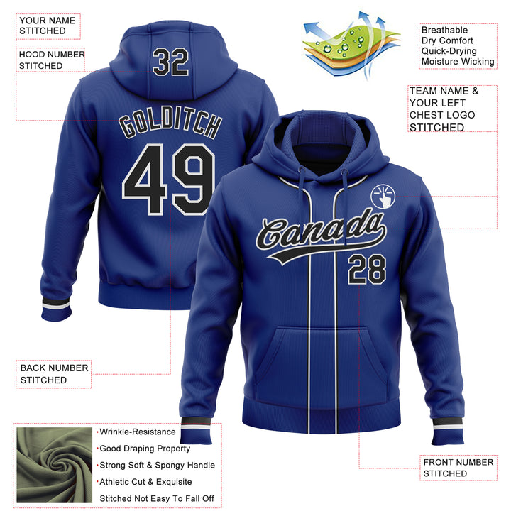 Custom Stitched Royal Black-White Baseball Pullover Sweatshirt Hoodie