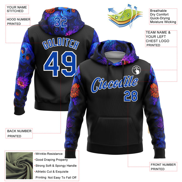 Custom Black Thunder Blue-White 3D Skull Roses Floral Calavera Day Of The Dead Dia de los Muertos Sports Pullover Sweatshirt Hoodie