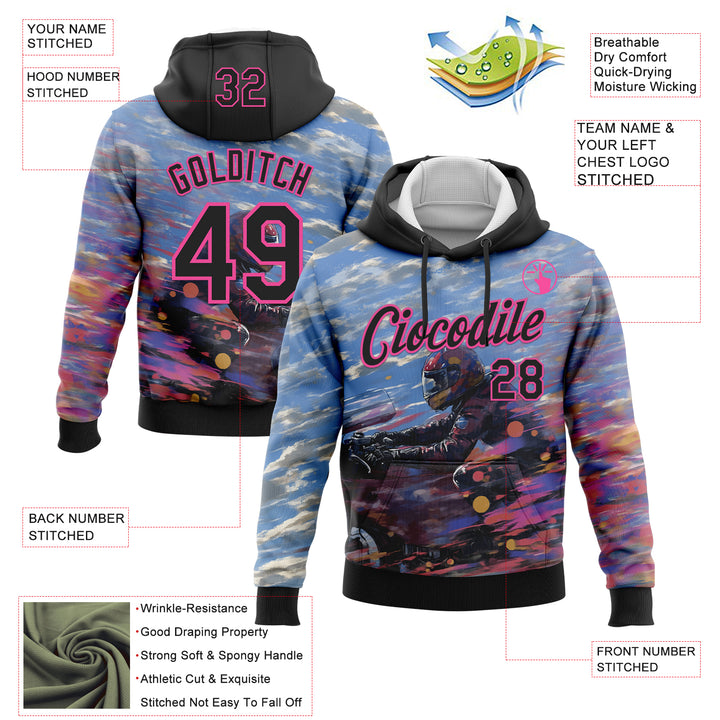 Custom Stitched Blue Black-Pink 3D Pattern Design Motorcycle Motocross Racing Sports Pullover Sweatshirt Hoodie