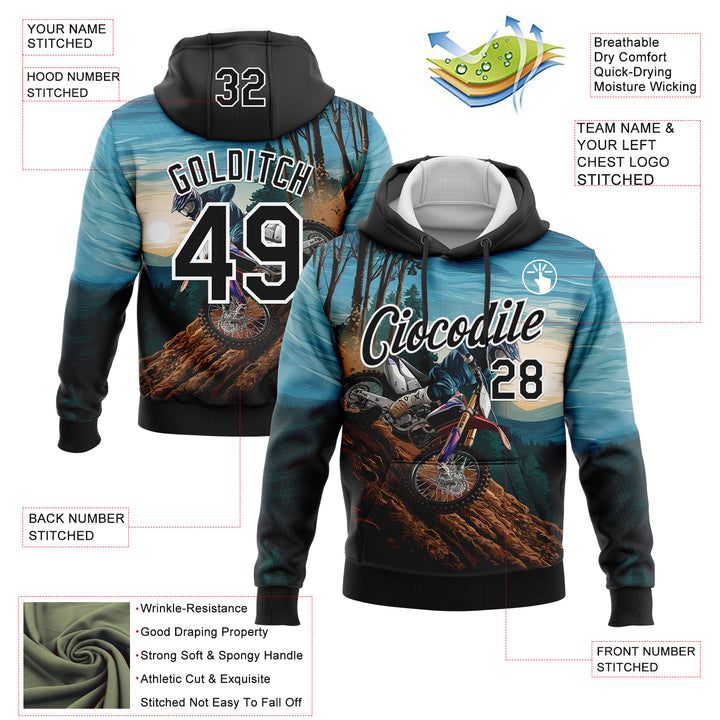 Custom Stitched Blue Black-White 3D Pattern Design Motorcycle Motocross Racing Sports Pullover Sweatshirt Hoodie