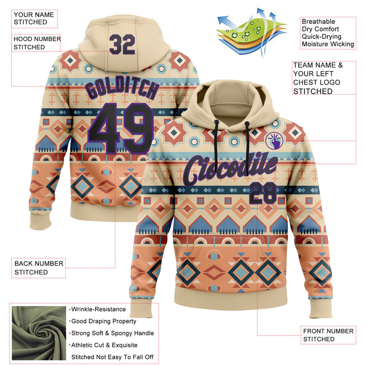 Custom Stitched City Cream Black-Purple 3D Pattern Design Tribal Ethnic Native American Sports Pullover Sweatshirt Hoodie