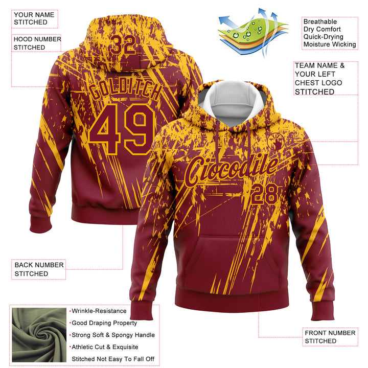 Custom Stitched Crimson Gold 3D Pattern Design Splash Grunge Art Sports Pullover Sweatshirt Hoodie