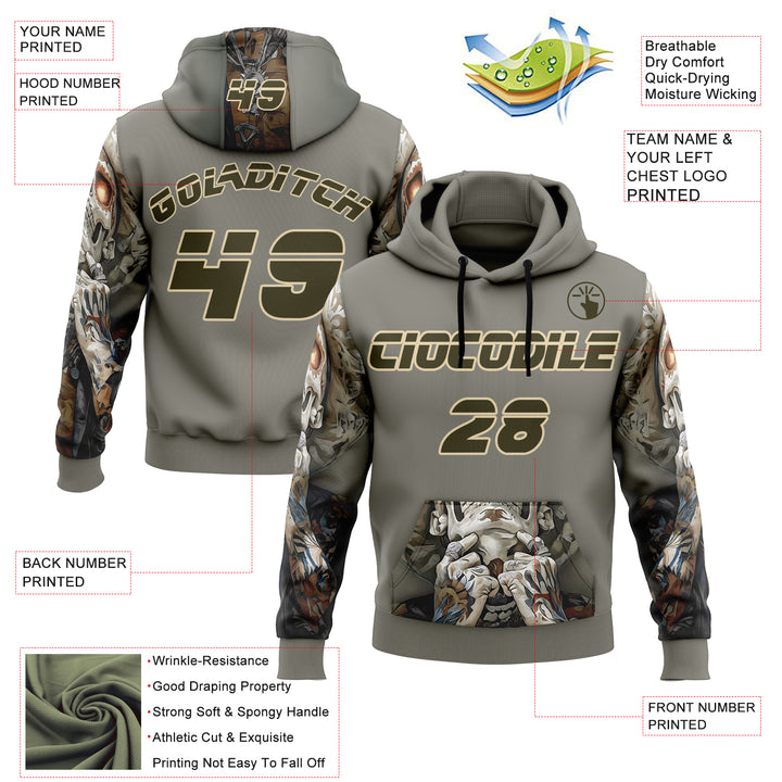 Custom Gray Olive-City Cream 3D Skull Tattoo Sports Pullover Sweatshirt Hoodie