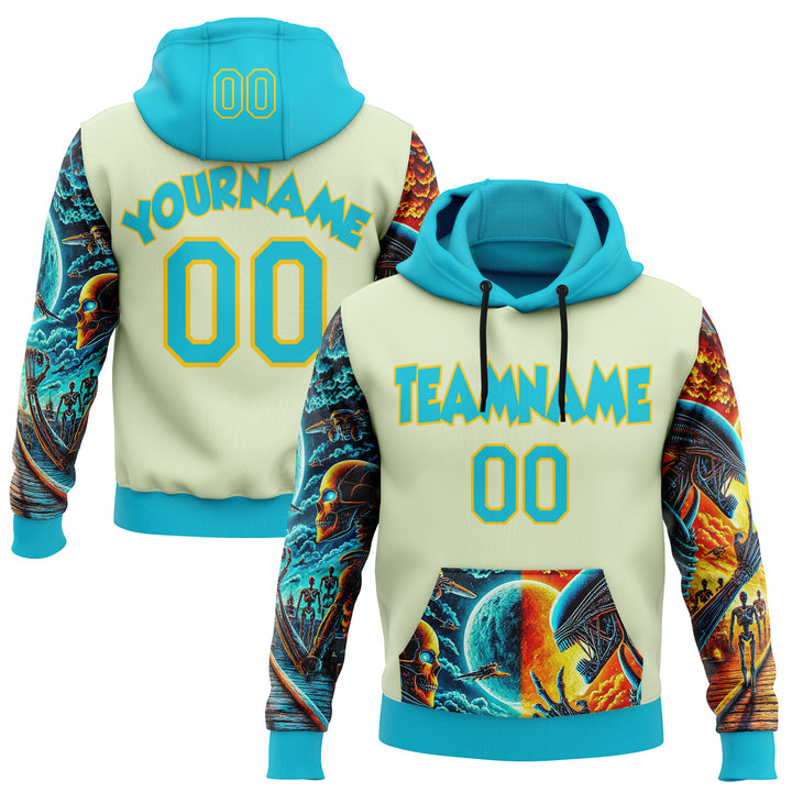 Custom Green Lakes Blue-Yellow 3D Skull Alien Sports Pullover Sweatshirt Hoodie