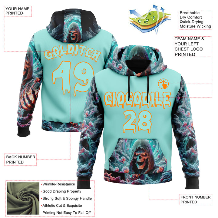 Custom Ice Blue Bay Orange 3D Skull Sports Pullover Sweatshirt Hoodie