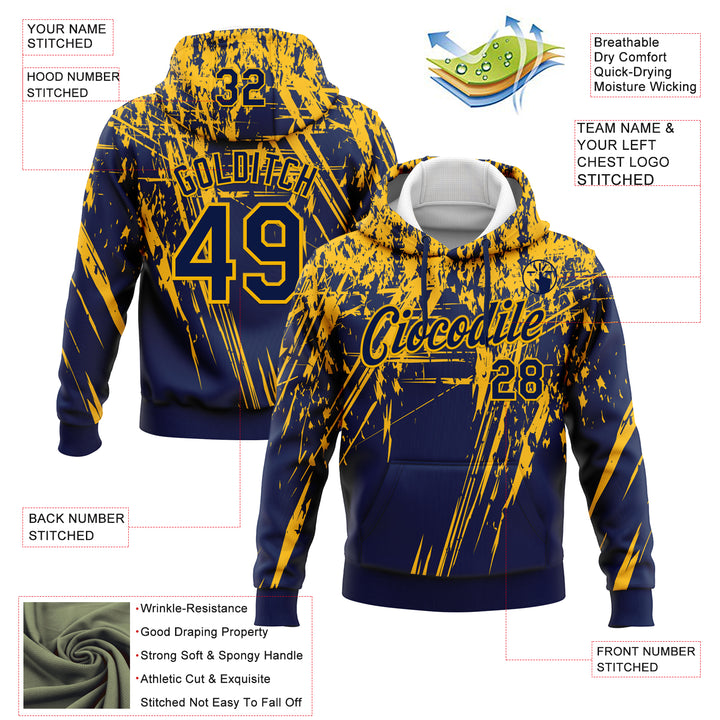 Custom Stitched Navy Gold 3D Pattern Design Splash Grunge Art Sports Pullover Sweatshirt Hoodie