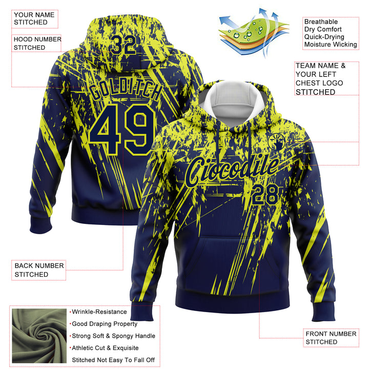 Custom Stitched Navy Neon Yellow 3D Pattern Design Splash Grunge Art Sports Pullover Sweatshirt Hoodie