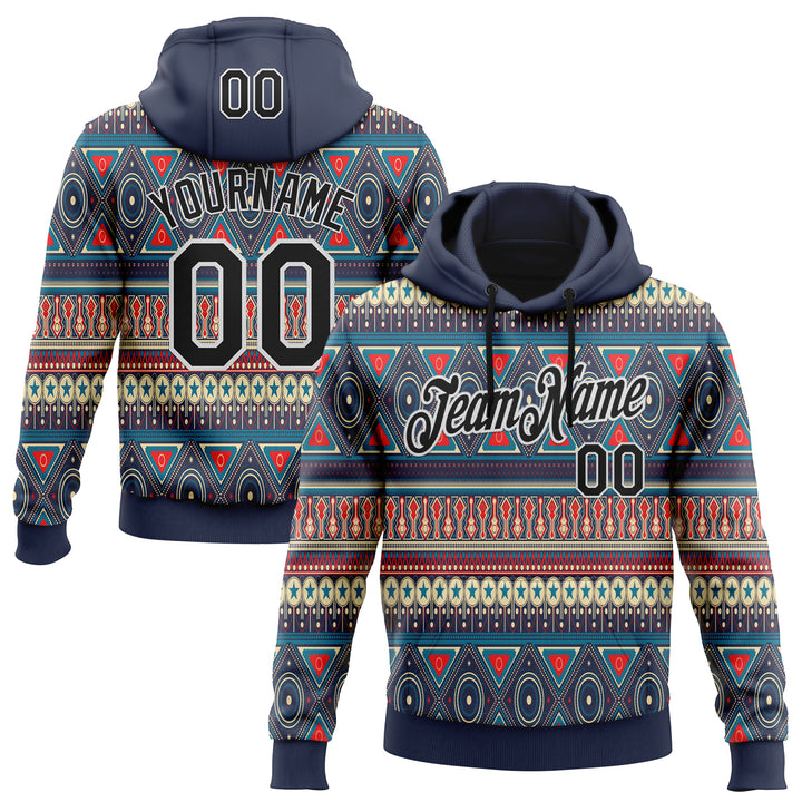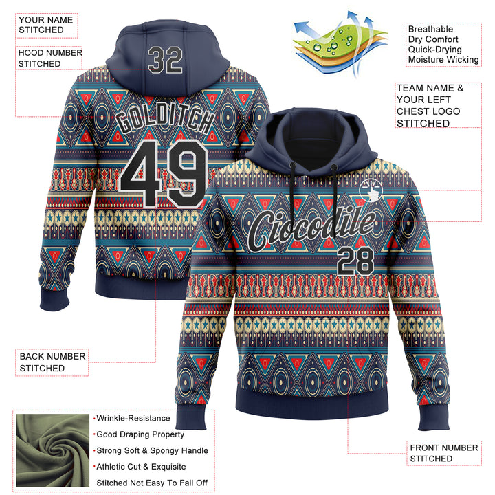 Custom Stitched Navy Black-White 3D Pattern Design Tribal Ethnic Native American Sports Pullover Sweatshirt Hoodie