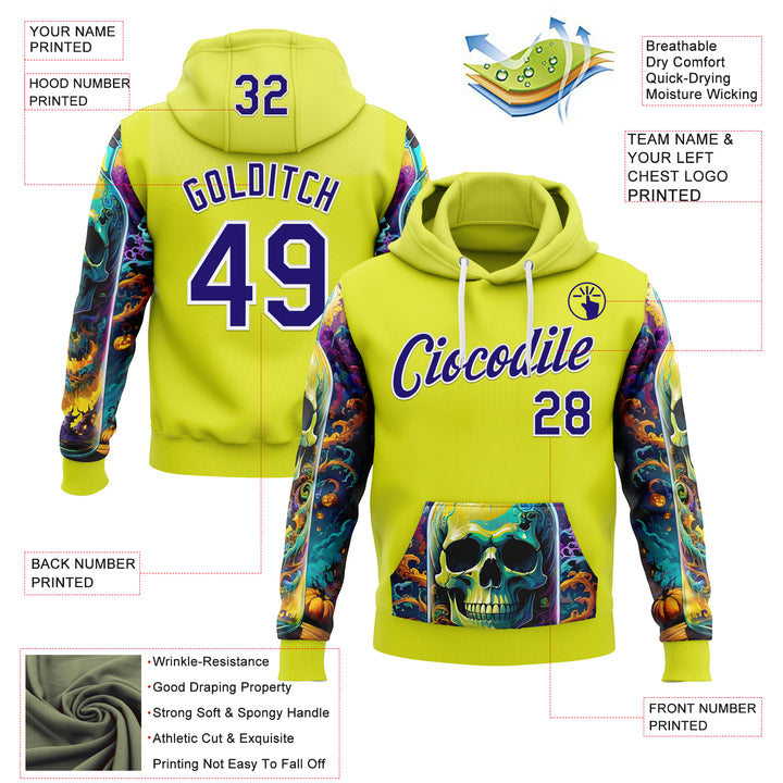 Custom Neon Yellow Dark Purple-White 3D Skull Psychedelic Sports Pullover Sweatshirt Hoodie