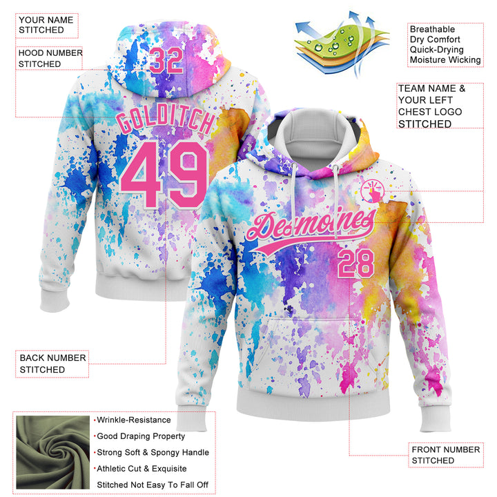 Custom Stitched White Pink 3D Pattern Design Watercolor Grunge Art Sports Pullover Sweatshirt Hoodie