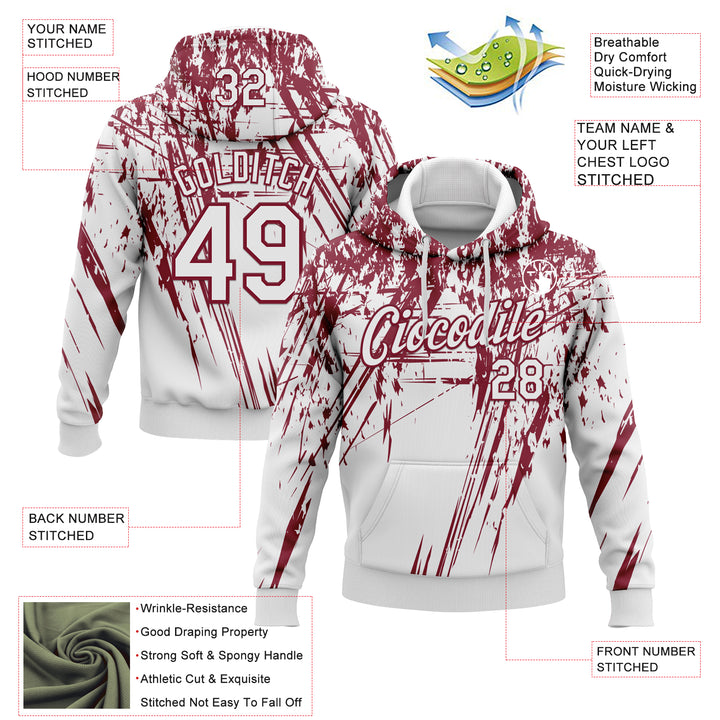 Custom Stitched White Crimson 3D Pattern Design Splash Grunge Art Sports Pullover Sweatshirt Hoodie