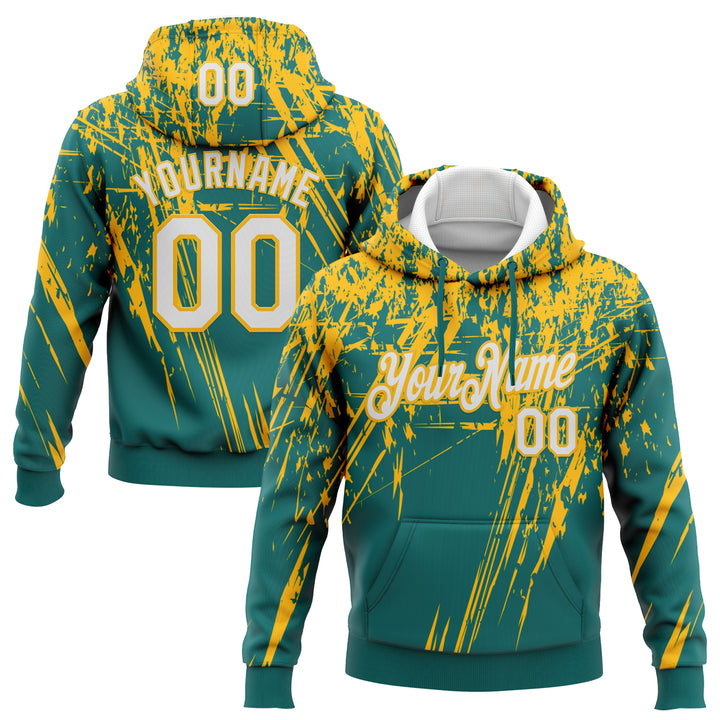 Custom Stitched Teal White-Gold 3D Pattern Design Splash Grunge Art Sports Pullover Sweatshirt Hoodie