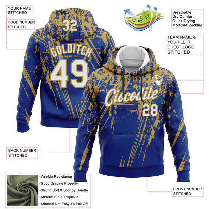 Custom Stitched Royal White-Old Gold 3D Pattern Design Splash Grunge Art Sports Pullover Sweatshirt Hoodie