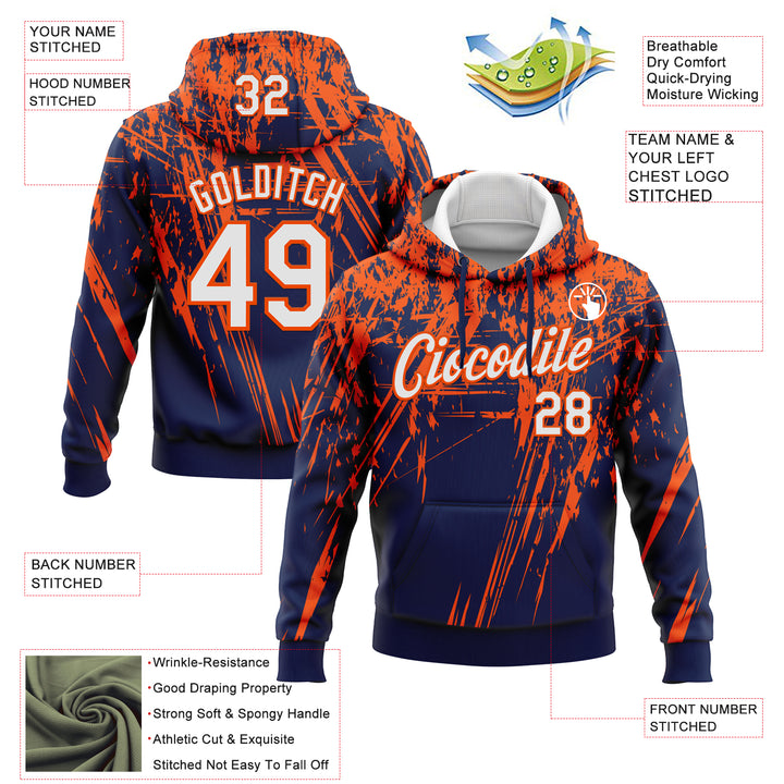 Custom Stitched Navy White-Orange 3D Pattern Design Splash Grunge Art Sports Pullover Sweatshirt Hoodie