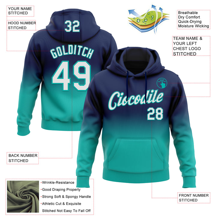 Custom Stitched Navy White-Aqua Fade Fashion Sports Pullover Sweatshirt Hoodie