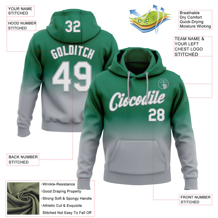 Custom Stitched Kelly Green White-Gray Fade Fashion Sports Pullover Sweatshirt Hoodie