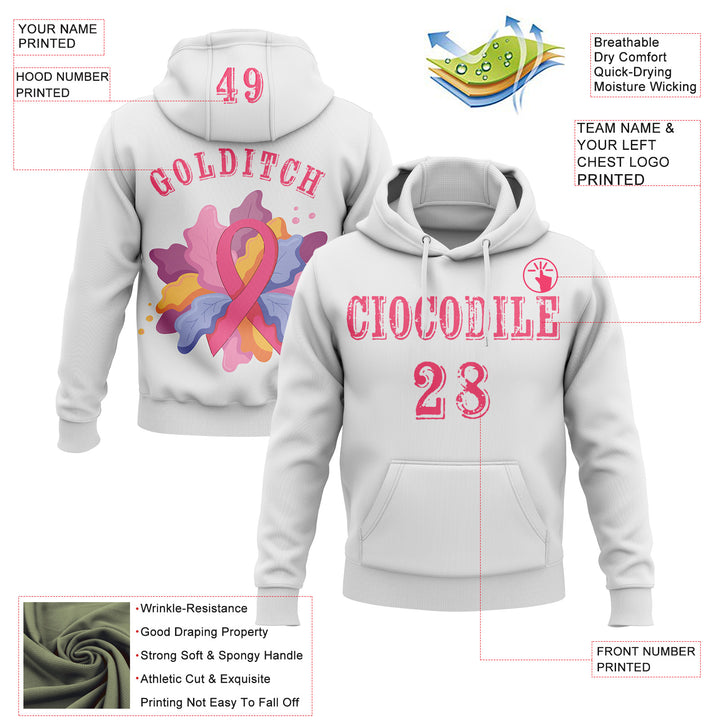 Custom White Neon Pink 3D Pink Ribbon Breast Cancer Awareness Women Health Care Support Sports Pullover Sweatshirt Hoodie
