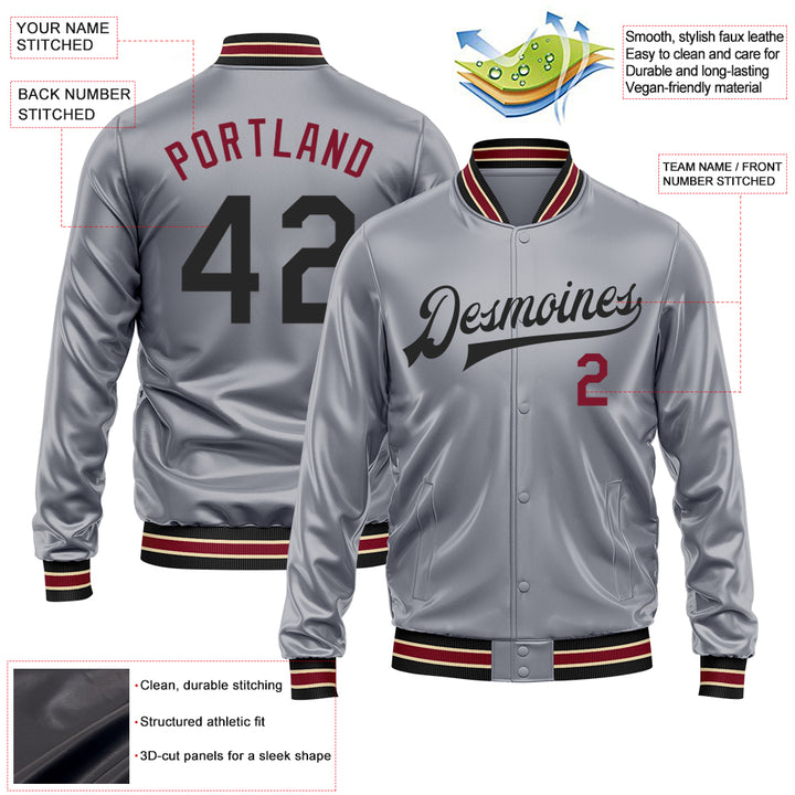 Custom Gray Black-Crimson Bomber Full-Snap Varsity Faux Leather Letterman Jacket