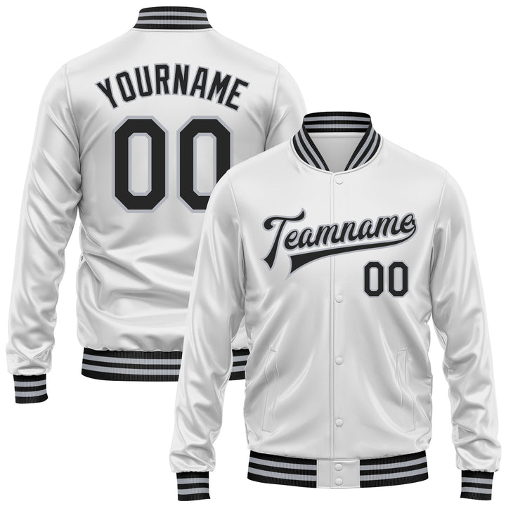 Custom White Black-Gray Bomber Full-Snap Varsity Faux Leather Letterman Jacket