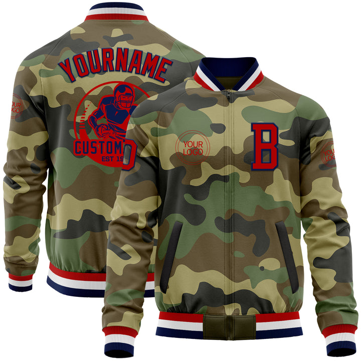 Custom Camo Red-Navy Bomber Varsity Letterman Salute To Service Zipper Jacket