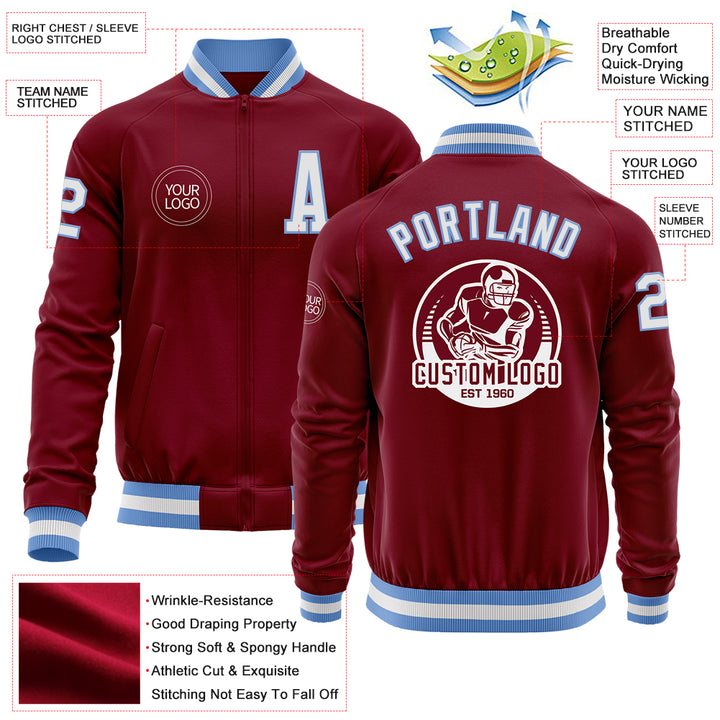 Custom Crimson White-Light Blue Bomber Varsity Letterman Zipper Jacket
