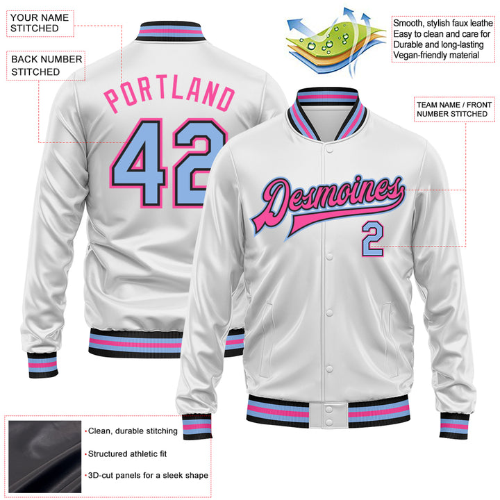 Custom White Light Blue Pink-Black Bomber Full-Snap Varsity Faux Leather Letterman Jacket