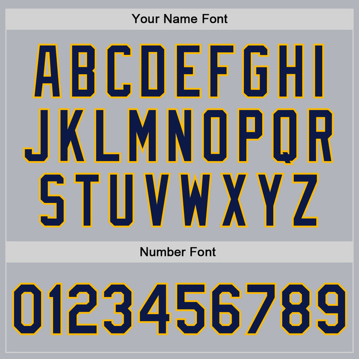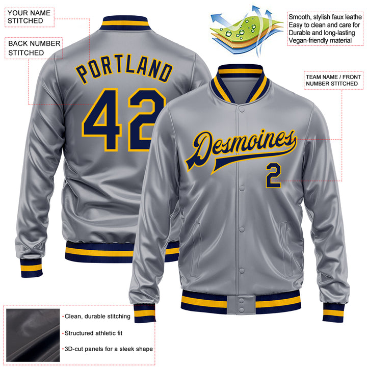 Custom Gray Navy-Gold Bomber Full-Snap Varsity Faux Leather Letterman Jacket