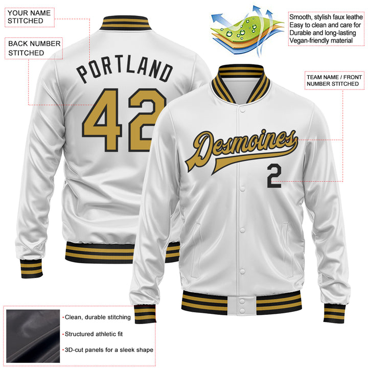 Custom White Old Gold-Black Bomber Full-Snap Varsity Faux Leather Letterman Jacket
