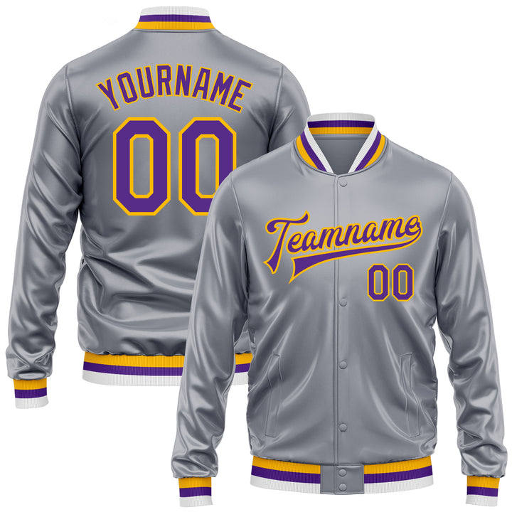 Custom Gray Purple-Gold Bomber Full-Snap Varsity Faux Leather Letterman Jacket