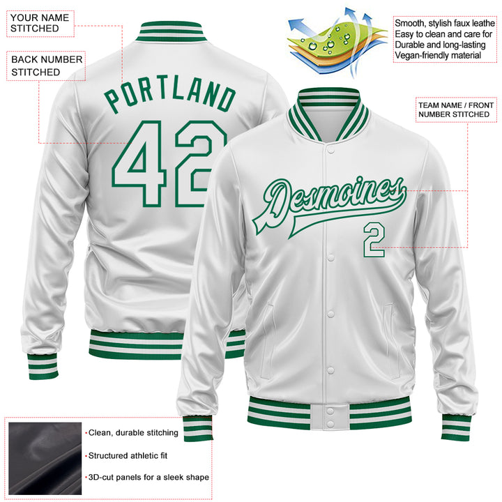 Custom White White-Kelly Green Bomber Full-Snap Varsity Faux Leather Letterman Jacket