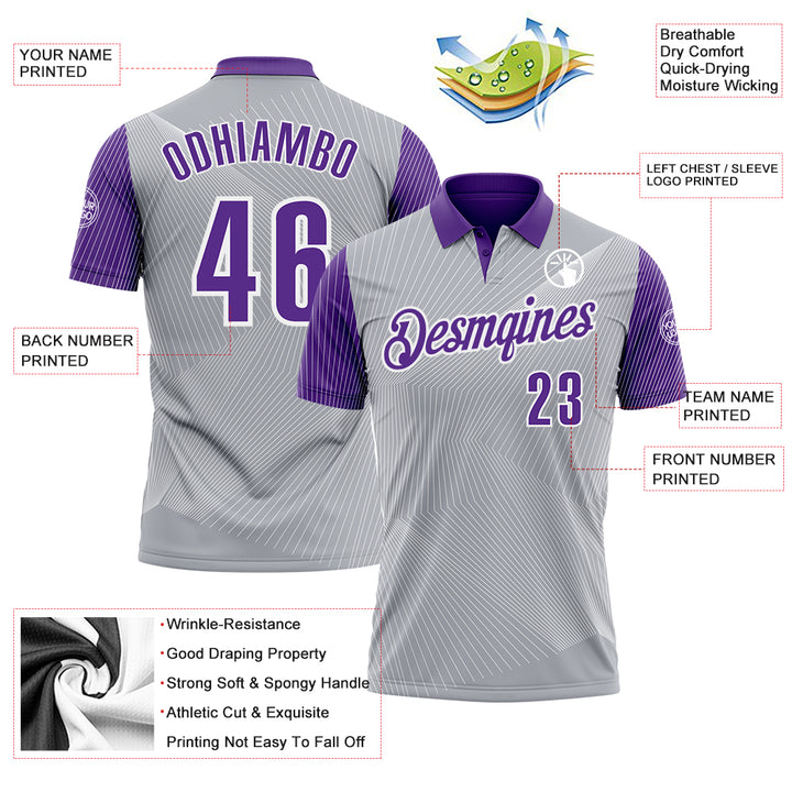 Custom Gray Purple-White 3D Bowling Line Performance Polo Shirt