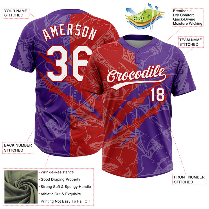 Custom Graffiti Pattern White Purple-Red 3D Scratch Two-Button Unisex Softball Jersey