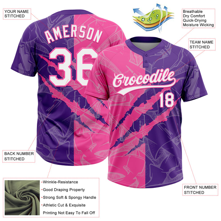 Custom Graffiti Pattern White Purple-Pink 3D Scratch Two-Button Unisex Softball Jersey