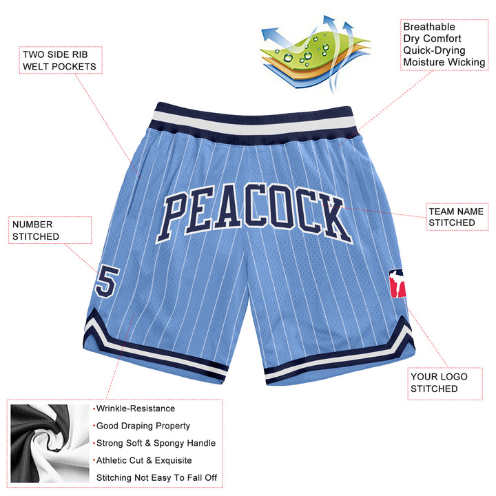 Custom Light Blue White Pinstripe Navy-White Authentic Basketball Shorts