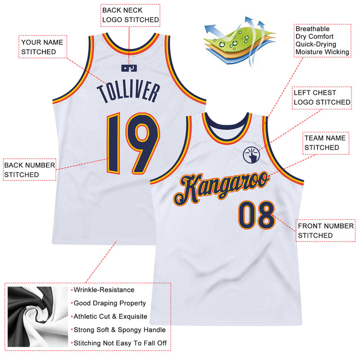 Custom White Navy-Orange Authentic Throwback Basketball Jersey
