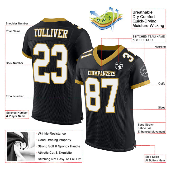 Custom Black White-Old Gold Mesh Authentic Football Jersey