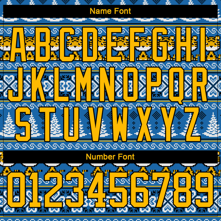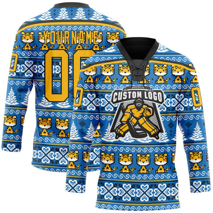 Custom Light Blue Gold-Black Christmas Tree And Tiger 3D Hockey Lace Neck Jersey
