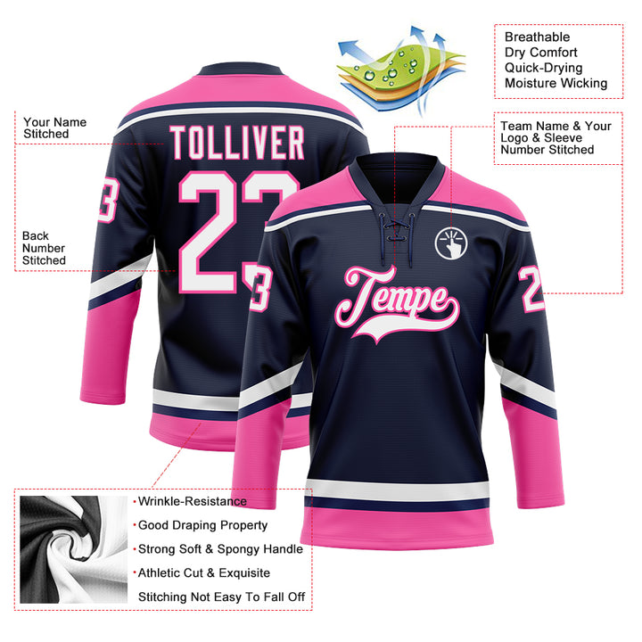 Custom Navy White-Pink Hockey Lace Neck Jersey