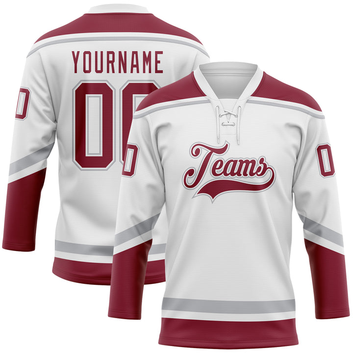 Custom White Crimson-Gray Hockey Lace Neck Jersey
