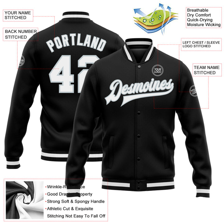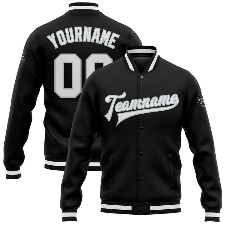 Custom Black White-Silver Bomber Full-Snap Varsity Letterman Jacket